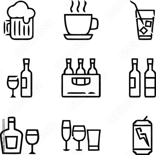 glasses, bottle, kitchen, cup, drink, hot drink, beer, wine, tea, cocktail, icon, set, symbol, food, beverage, graphic, collection, illustration, vector, design, signs, cafes, bar, menu, eatery, pub, liquid, alcohol, caffeine, water, juice, milk, soda, craft, abstract, simple, modern, minimal, flat, line, outline, element, logotype, web, app, pictogram, style