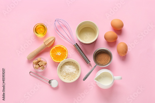 Set of kitchen utensils and ingredients for preparing bakery on color background