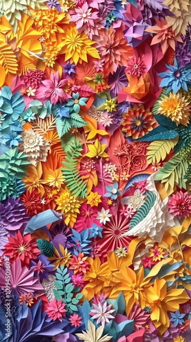 Set of layered paper cutouts in different colors and textures stacked to form a 3D effect on white background, sculpted paper elements, layered paper cutouts, carved paper scraps