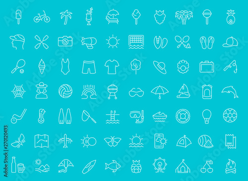 summer, icon, line, travel, holiday, vacation, season, collection, set, thin, vector, flat, infographic, linear, element, logotype, design, outline, info, beach, sun, sea, tropical, fun, nature, palm, water, relax, resort, ocean, ice cream, cocktail, hot, weather, beach chair, swimwear, bicycle, goggles, diving, golf, sport, activity, hobby, butterfly, hat, yacht, pool, badminton, colours
