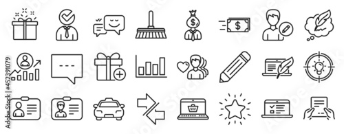 Set of line icons, such as Id card, Career ladder, Report diagram icons. Cleaning mop, Copyright laptop, Money transfer signs. Receive file, Pencil, Edit person. Add gift, Taxi, Rank star. Vector