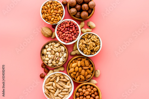 nut, background, food, nature, kitchen, healthy, natural, seed, set, snack, vegetarian, ingredient, organic, mix, vegan, walnut, hazelnut, protein, pecan, dry, selection, brown, raw, assortment, dried, nut, up high, vegetarian, eco, nourishment, top, view, bowl, macadamia, pink, copy, space, copy space, text