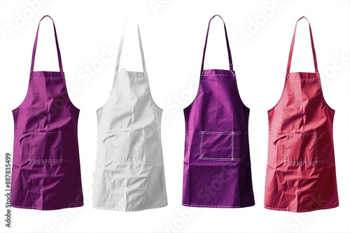 Set of magenta purple pink blank apron restaurant cafe kitchen cook chef uniform, front and flay lay on cutout file. Mockup template for artwork graphic design