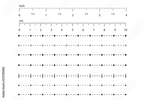 Set of metric abstract, rulers imperial scale with different geometric shapes. Abstract scale for a ruler from geometric shapes. Size indicator units. Measuring scale, markup for rulers.