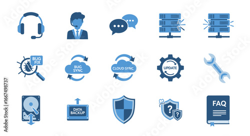 Set of modern flat icons for cloud technology, data storage, and IT support services, designed for business and technology concepts