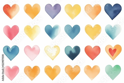 Set of multicolored watercolor-style hearts on a white background, artistic concept, romantic, creative, vibrant design