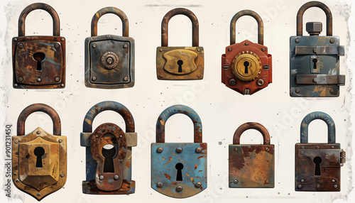 Set of old padlocks. Vintage lock security and safety mechanisms in cartoon.