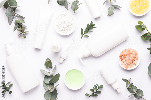 Set of organic eco skin care products in white unbranded containers , beautiful flowers and eucalyptus leaves on white background top view. Cosmetic branding concept.