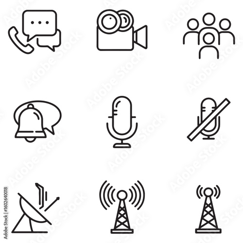 icon, communication, technology, wireless, messaging, chat, call, phone, video, camera, group, meeting, people, bell, notification, microphone, mute, antennae, satellite, tower, signal, broadcasting, transmitting, outline, vector, graphic, design, element, simple, black
