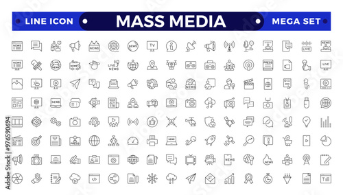 Set of Outline icons news, mass media, and fake news. Outline symbol collection. related to social networks, public media, journalism, communication, networking.