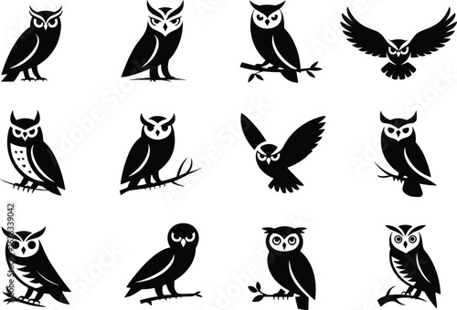 Set of owl silhouettes perched and flying, black and white vector illustrations of owls in various poses and styles