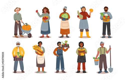 harvest, people, set, thanksgiving, festival, autumn, concept, isolated, harvesting, gardening, background, garden, woman, man, holiday, banner, white, collection, celebration, vegetable, seasonal, farmer, object, agriculture, character, farming, diversity, racial, element, flat, design, vector, traditional, illustration, men at work, cartoon, farm, plant, season, ethnicity, food, black, puckered, wheat, poster, picking, fall, american