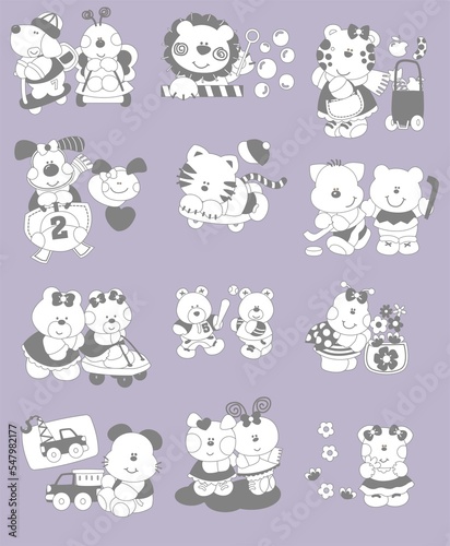 Set of pets, animals, puppies, tiger, cats, lion, giraffe, teddy bear, baby fashion, rapport print, confection,