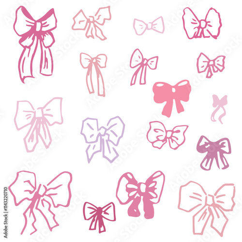 Set of pink ribbons, Vector graphic isolated, doodle, hand draw, with texture.