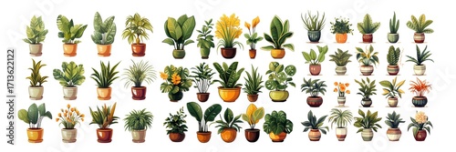 plant, green, pot, growth, garden, foliage, leaf, set, leaf, botanical, natural, growing, decorative, eco, hanging, illustration, indoor, flowerpot, background, home, flower, collection, cartoon, vector, flat, decor, white, interior, house, vase, isolated, transparent