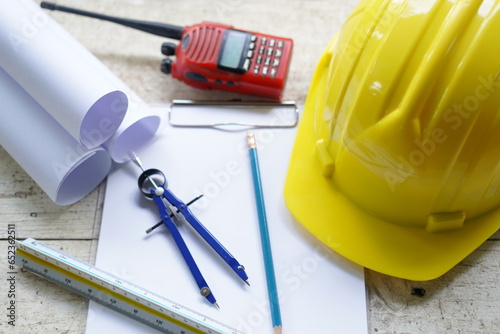 Set of professional construction tools and safety helmet on a work table. Top view. Tools. Various tools on a wooden table. engineering drawing Tools to work beyond architectural blueprints