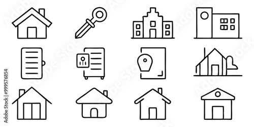 Set of Property and Building Line Icons - Houses, Apartments, Commercial Structures, and Storefronts on white background
