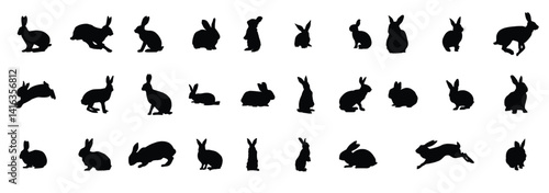 Set of rabbits silhouette in different poses. Hand drawn black silhouettes of easter bunnies isolated on white background. Vector illustration of decorative elements for design decor.