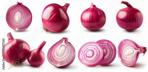 Set of red onions, sliced and whole, on a white background