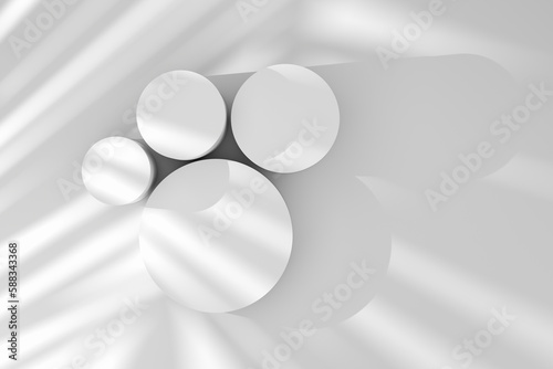 Set of round white podiums with natural daylight and plant shadows.