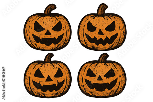 halloween, pumpkin, jack-o-lantern, scarey, skittish, evil, face, icon, vector, illustration, silhouette, cartoon, set, design, holiday, autumn, october, creepy, fear, horror, symbol, signs, graphic, orange, black, isolated, sticker, decoration, celebration, trick or treat, monster, grin, smile, art, drawing, tradition, lantern, vegetable, gourd, vintage, grunge, textured