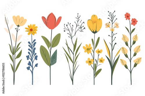 Set of simple colorful spring flowers illustration on a white background, in a flat design style