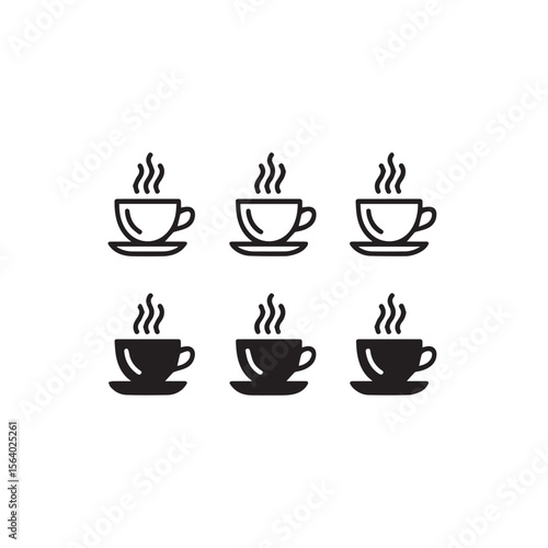 Set of six steaming coffee cup icons in black and white line art and solid silhouette styles