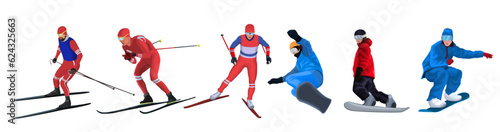 Set of skier, snowboarder, ski, activity. Snow sport, winter extreme recreation, action lifestyle. Slalom, jump, athlete, equipment, freestyle. Isolated on white background. Vector illustration