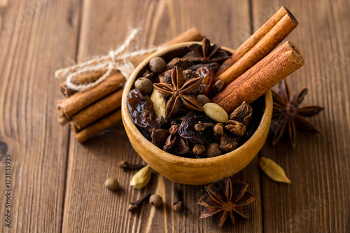 Set of spices for mulled wine in ceramic bowl on wooden table.