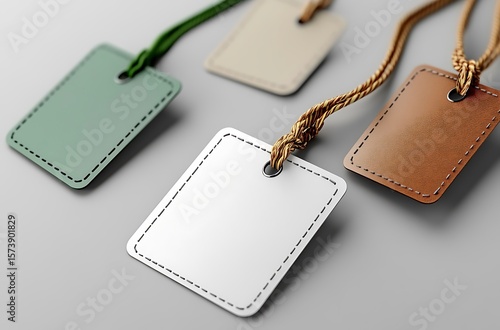 Set of Stitched Rectangular Tags in Earth Tones on Gray Surface