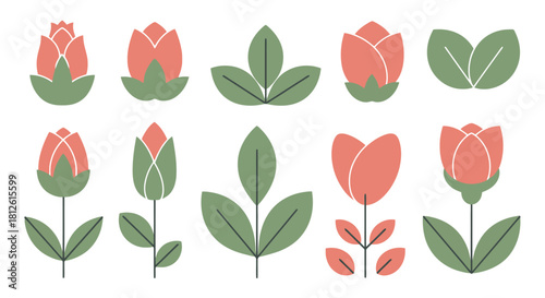 flower, leaf, floral, geometric, abstract, stylised, modern, design, vector, illustration, plant, nature, botanical, spring, summer, garden, bloom, blossom, stem, foliage, green, coral, white, simple, minimalist, flat, graphic, icon, set, collection, element, decoration, ornament, pattern, background, art, creative, fresh, growth, organic, shape, symmetry, beauty, elegant, vibrant, clean, digital, artwork