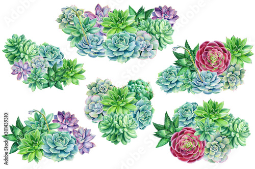 set of succulents on a white isolated background, watercolor, botanical illustration, bouquets of green plants