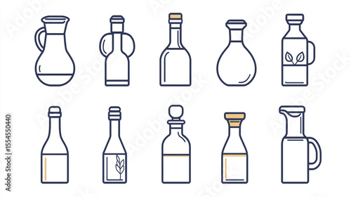 Set of thin-line kitchen oil and sauce icons olive oil bottle, vinegar flask, carafe, sauce jar, dispenser, and ampoule