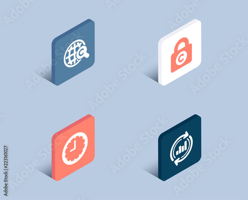Set of Time, International Сopyright and Сopyright locker icons. Update data sign. Office clock, World copywriting, Private information. Sales chart. 3d isometric buttons. Flat design concept