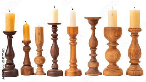 Set of various beautiful wooden pillar candle stands isolated on white background