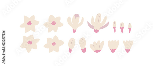 Set of various flower elements. Floral vector flat illustration. Magnolia flower buds and petals. Botanical hand drawn spring clipart