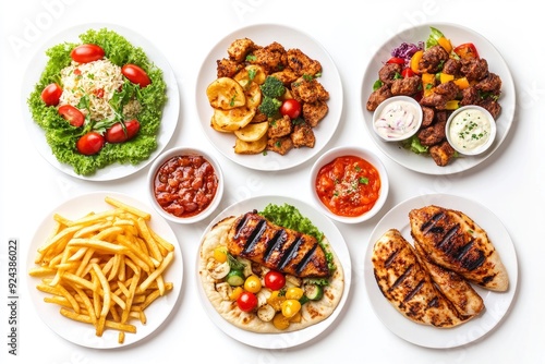 Set of various plates of food, top view, isolated on white background. with generative ai