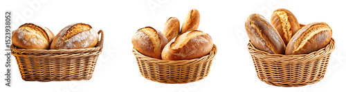 Set of various wicker basket with several loaves of bread isolated on transparent background