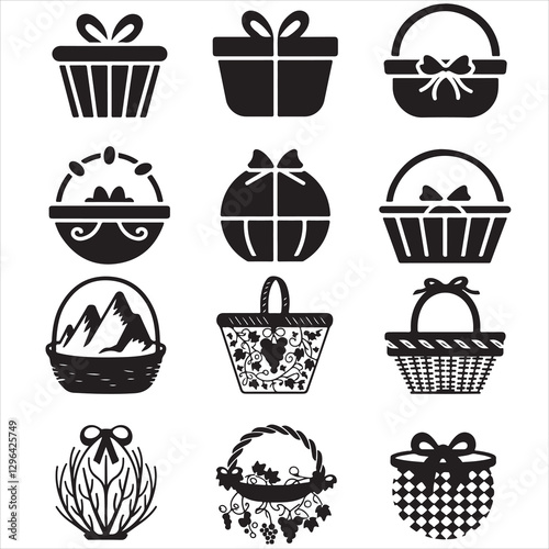 set of vector shopping basket, gift basket silhouette