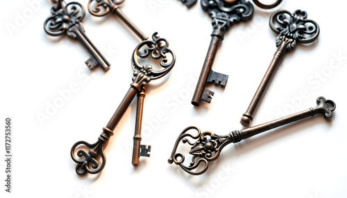 Set of vintage ornate keys on white background, Side lit