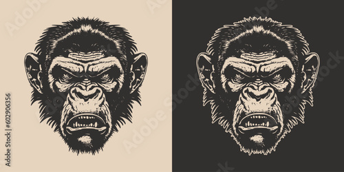 Set of vintage retro angry monkeys. Can be used for logo, emblem, poster, dadge design. Monochrome Graphic Art. Engraving style. Vector