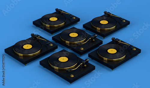 Set of vinyl record player or DJ turntable with retro vinyl disk on blue.
