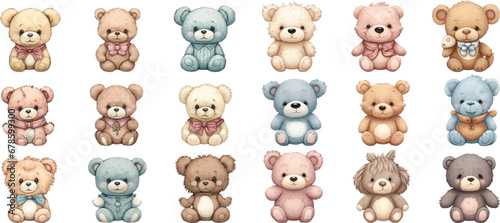 Set of watercolor cute teddy bear illustrations on white background.