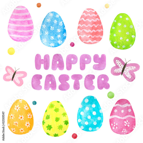 Set of watercolor Easter colored painted eggs isolated on a white background.