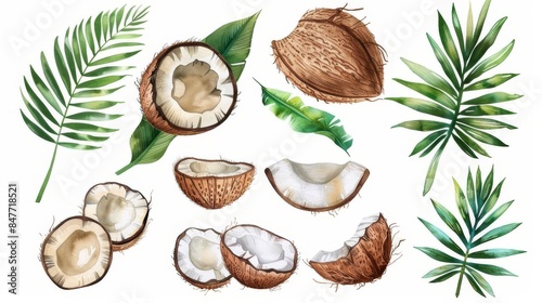 set of watercolor illustrations, coconut, different pieces of coconut and tropical leaves on a white background