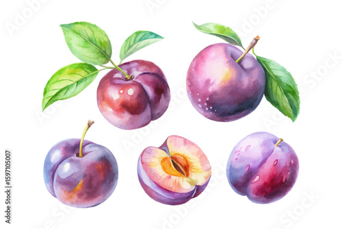 plum, juicy, fruit, illustration, purple, ripe, food, healthy, nature, vector, organic, watercolor, freshness, closeup, nourishment, fresh, sweet, healthy eating, isolated, vegetarian, design, leaf, diet, cut-out, realistic, white, red, apple, plum, green, dessert, berry, delicious