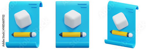 Set of White Cube and Yellow Pencil on Blue Scroll 3d Render Icon Illustration