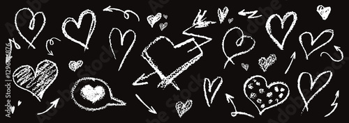 Set of white hearts signs drawn by wax pencil. Love symbols in doodle style. Collection of hand drawn kid hearts elements for valentine card or rock, hip hop music poster design. Vector illustration