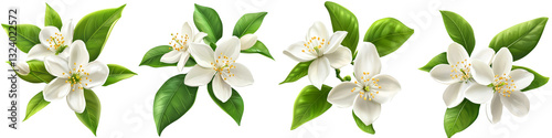 set of White lemon flowers with green leaves, white lemon flowers and green leaves, white lemon flowers surrounded by green leaves, white flowers, green leaves, on a transparent backgrounds