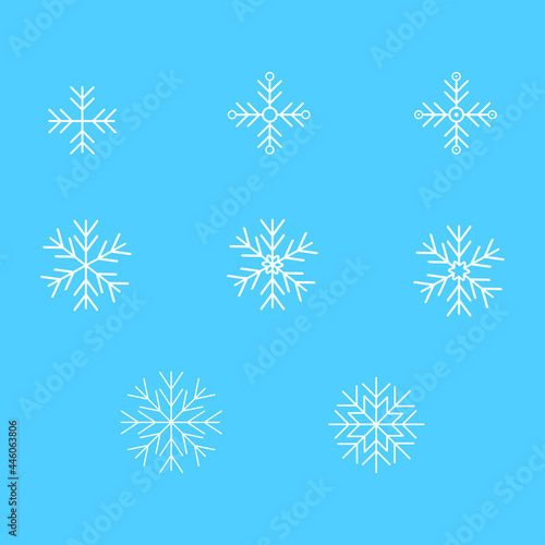 Set of white snowflakes icons on a blue background. Snowflake icons. Snowflake vector icon